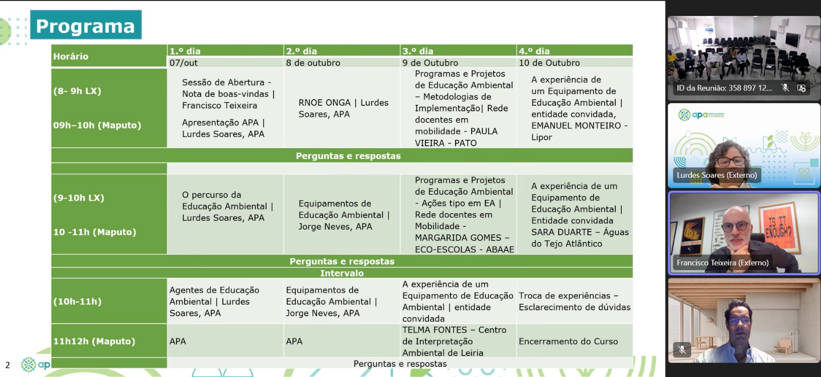A Agência Portuguesa do Ambiente, em parceria com o Centro de Interpretação Ambiental de Maputo, vai promover de 7 a 10 de outubro um curso de educação ambiental para técnicos e animadores de Moçambique.