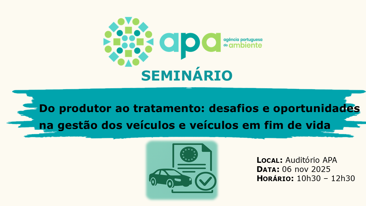 Este encontro técnico visa promover o debate e a partilha de conhecimentos sobre o novo regulamento europeu relativo a veículos em fim de vida (VFV), bem como refletir sobre os desafios e oportunidades ao longo de todo o fluxo, desde os produtores até aos operadores de tratamento. Serão abordadas problemáticas identificadas pela APA, VALORCAR e ANCAV nomeadamente no que se refere à rastreabilidade, ao cumprimento das metas de valorização e à responsabilidade alargada do produtor.