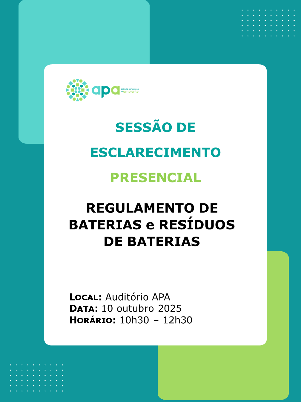 - 10h40 – Regulamento (UE) 2023/1542 (Eng.ª Mafalda Mota, Chefe de Divisão de Fluxos Específicos e Mercado de Resíduos (APA)