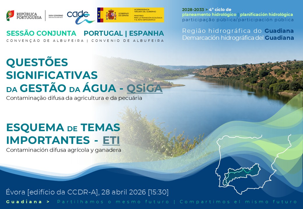 A Agência Portuguesa do Ambiente (APA) promove no dia 28 de abril, pelas 15h30 (PT), nas instalações da Comissão de Coordenação e Desenvolvimento Regional do Alentejo, em Évora, uma sessão de participação pública dedicada às Questões Significativas da Gestão da Água (QSiGA) da bacia hidrográfica do Guadiana, subordinada ao tema: “Contaminação difusa com origem na agricultura e pecuária”.