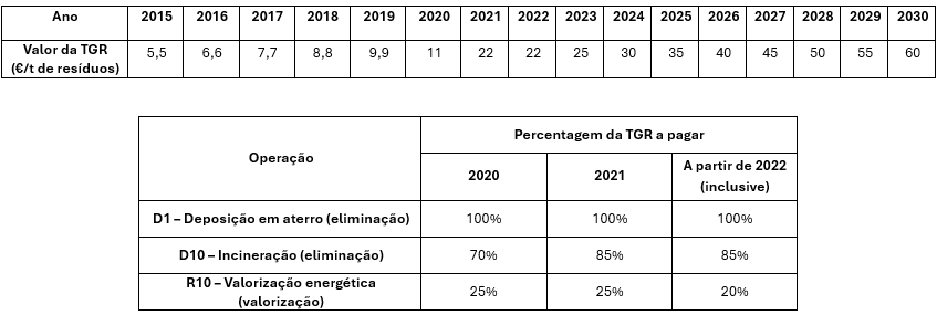O valor da Taxa de Gestão de Resíduos foi, inicialmente, definido pelo artigo 58.º do Regime Geral de Gestão de Resíduos (RRGR), com a redação dada pela Lei n.º 82-D/2014, de 31 de dezembro, e pelo Decreto-Lei n.º 92/2020, de 23 de outubro. O Decreto-Lei n.º 102-D/2020, de 10 de dezembro, , define o valor de TGR a cobrar até 2025, determinando que, a partir de 1 de janeiro de 2026, ao montante da TGR é acrescido de um valor por tonelada, a definir por despacho do membro do Governo responsável pela área do ambiente.