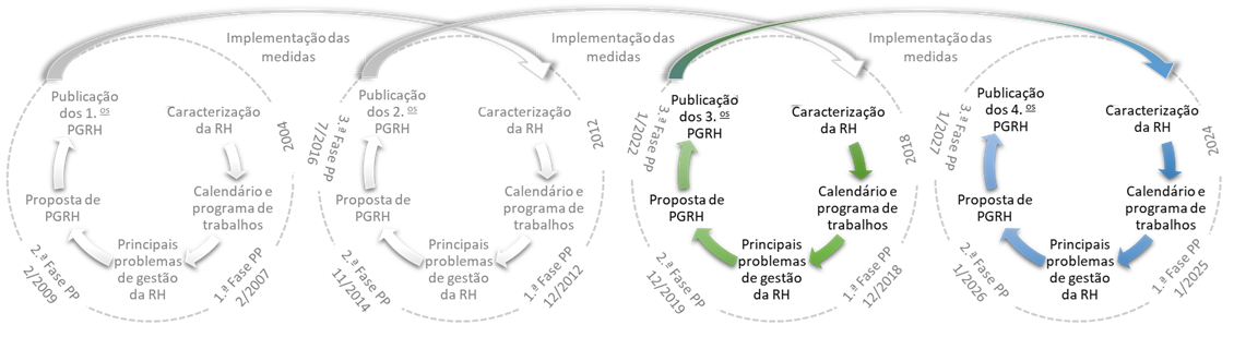 - 1.ª Fase - O Calendário e o Programa de Trabalhos para a elaboração de cada PGRH, incluindo as medidas de consulta a adotar, com a antecedência mínima de três anos em relação ao início do período a que se refere o PGRH;