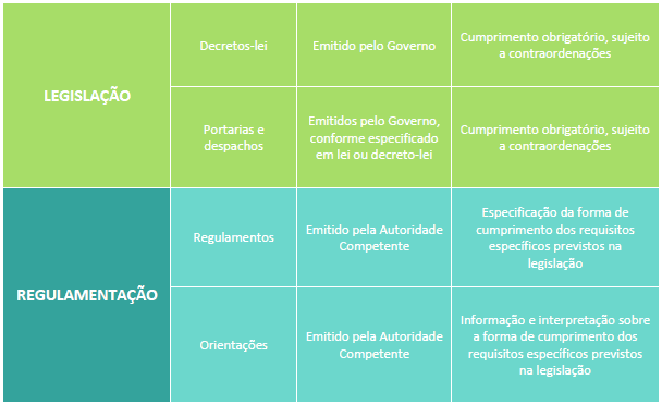 O quadro seguinte sumariza a sequência hierárquica desta regulamentação e a sua relação com a legislação de base: