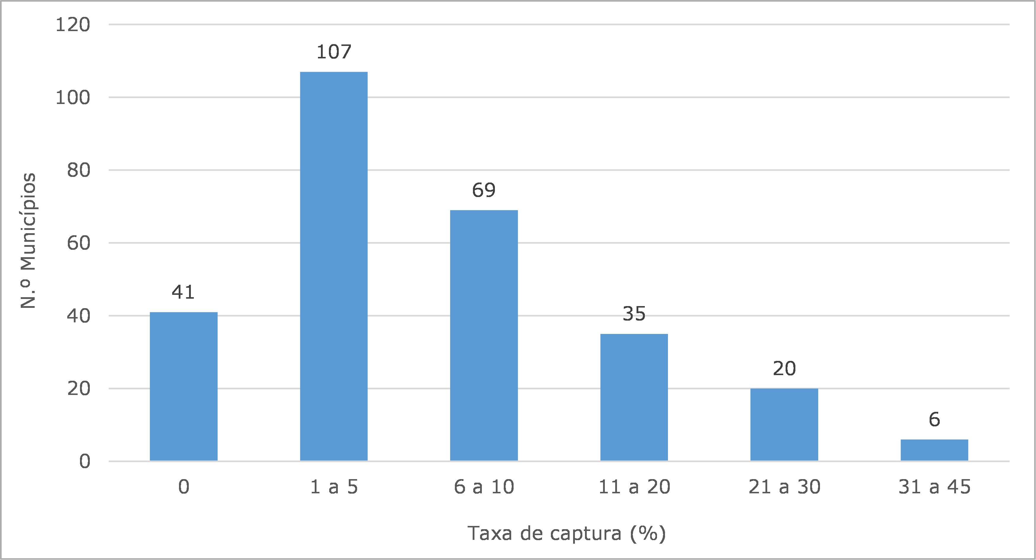 No que respeita à gestão de biorresíduos, verifica-se, conforme figura infra, que a maioria dos municípios apresenta uma taxa de captura que varia entre 1 e 5% do total de biorresíduos produzidos na sua área de intervenção, sendo igualmente de referir a existência de 41 municípios que ainda não implementaram qualquer modelo de recolha e/ou tratamento de biorresíduos.