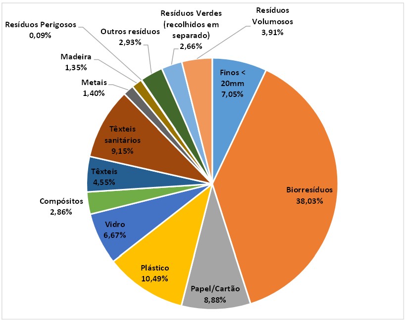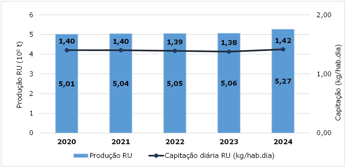 A produção de resíduos urbanos em Portugal Continental foi em 2024, superior a 5 milhões de toneladas, o que corresponde a uma capitação anual de 517 kg/hab.ano, ou seja uma produção diária de 1,4 kg por habitante.