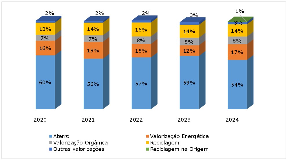 Em relação aos destinos finais verifica-se que a deposição em aterro, constitui em 2024, cerca de 54% do total de RU.