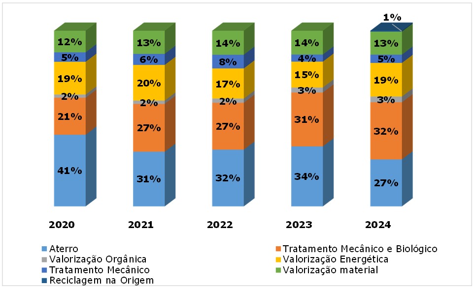 Em 2024 verifica-se um decréscimo (7 p.p.) da deposição de resíduos em aterro, passando o tratamento mecânico e biológico a ser o destino preferencial em termos percentuais (32%), revelando um aumento de 1 p.p..