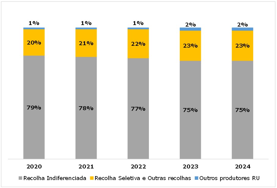 Embora, anualmente, a recolha seletiva apresente uma tendência crescente, a sua evolução é muito ténue, representando, tal como no ano anterior, 23% do total de resíduos urbanos recolhidos no País.