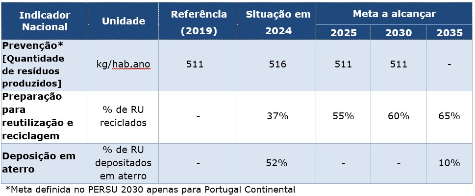 Apresenta-se na tabela seguinte, o posicionamento de Portugal em 2024 face às metas preconizadas nas Diretivas Comunitárias (Aterro e Resíduos).